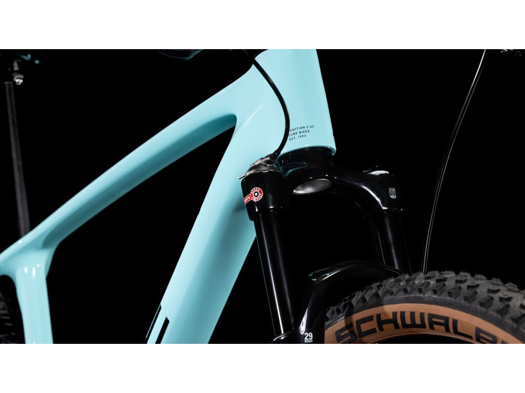 Když je srdcem skvělého kola rám, můžete začít s Reaction C:62 ONE. Ale pak Cube přidal převody Sram NX Eagle 1x12, aby měli dokonalý poměr pod palcem. Hydraulické kotoučové brzdy Magura MT Thirty spolupracují se širokými, přilnavými pneumatikami Schwalbe Racing Ray a Racing Ralph 2,25 palce, aby řídily vaši rychlost, takže můžete jet rychleji déle. Vzduchová vidlice Suntour Raidon 32 vpředu je snadno nastavitelná a udržuje přední kolo pohodlně nasazené a nasměrované správným směrem. Je to vše, co potřebujete.